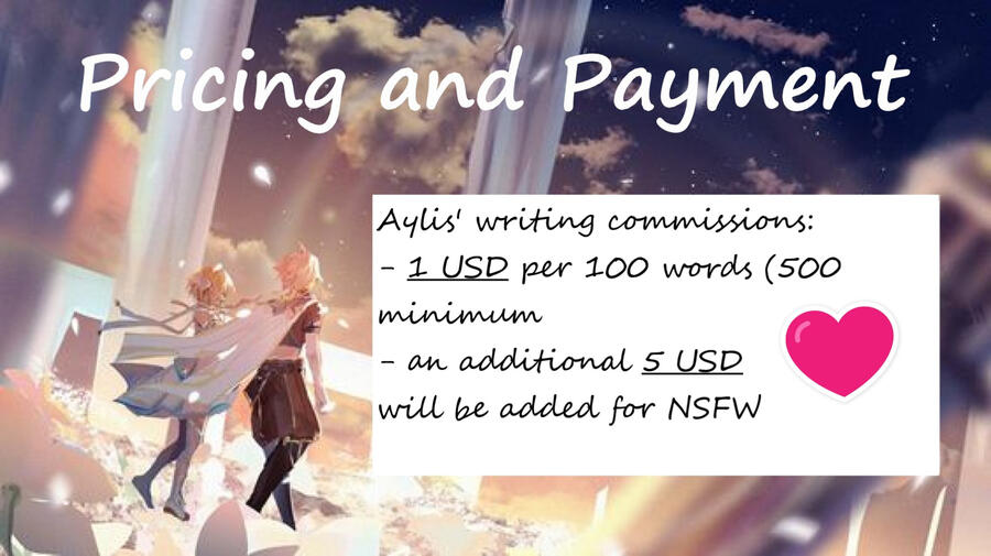 Lastly, I maintain the right to refuse certain commissions. Sometimes I may feel like a certain subject, character or fandom is out of my depth as a writer. Or I may not have the inspiration (at the time) to write a certain trope.